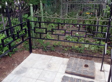 Следующим этапом стала установка ограждения. Уже готовую оградку мы привезли на участок, там собрали и выставили по периметру могилы не укрепляя. Параллельно с монтажом ограждения мы вкопали трубы на месте будущих цветников.